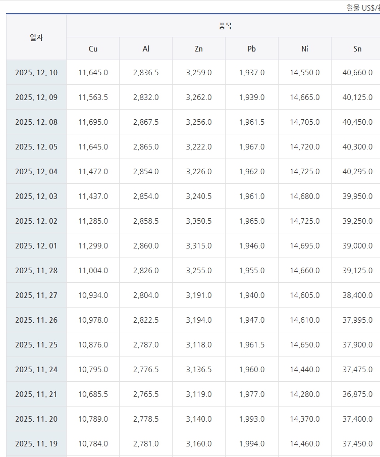 비철금속 LME 시세(2025/12/12)