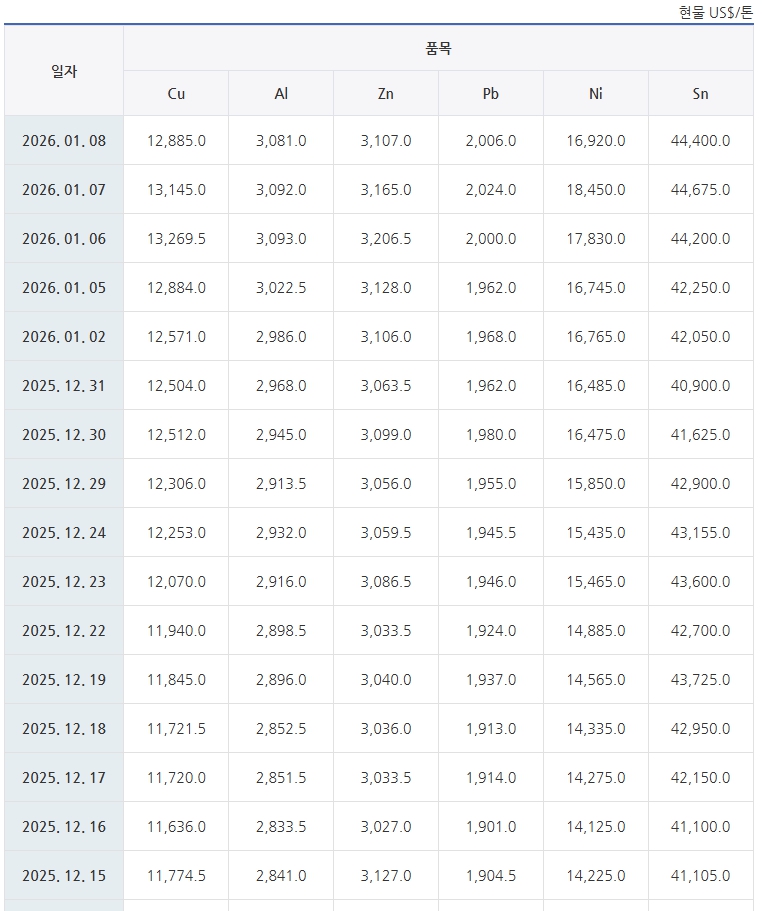비철금속 LME 시세(2026/01/09)